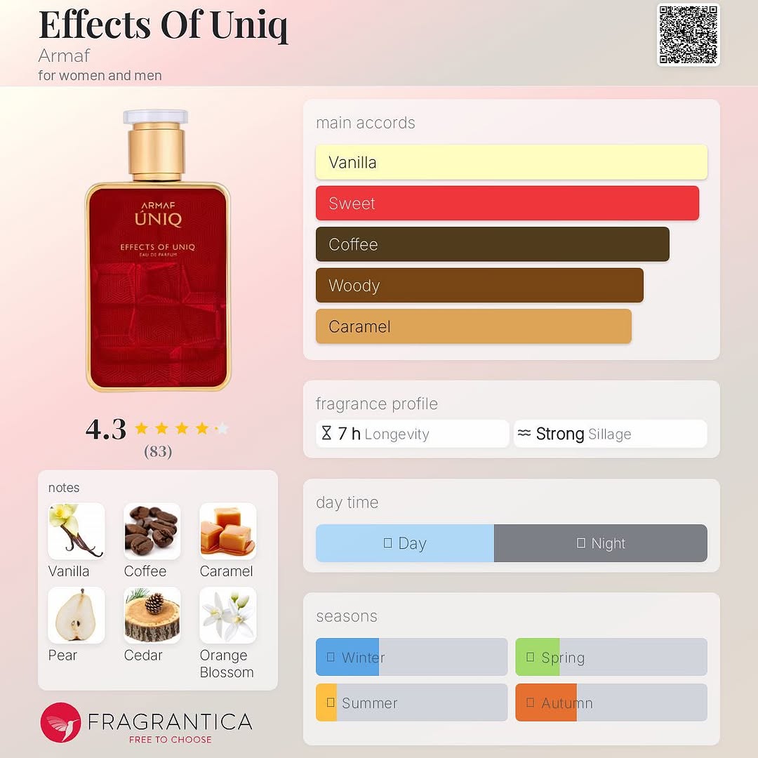 نت بالایی : ماندارین ، گلابی نت میانی : شکوفه پرتقال ، وانیل ، گلهای سفید نت پایانی : چوب سدر ، نعناع هندی ، مشک سفید ، قهوه ، کارامل